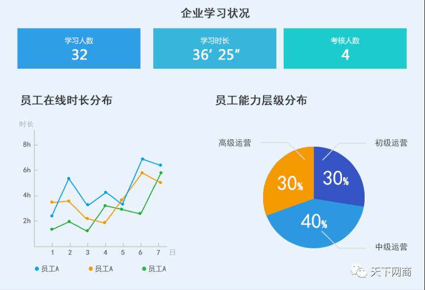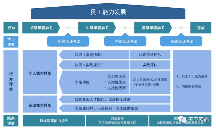 另外,当教育转化为产品,为企业和卖家服务的时候,都会面临效果呈现的问题。对此,詹海涛表示,方案将通过企业可视化数据、个人能力评测来实现一套逻辑链的关联。一个企业的线上、线下、所有的行为和学习成长的结果都会在数据这一层进行记录,最后用可视化的方式提供给卖家。