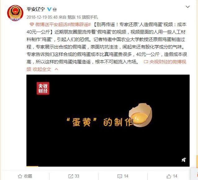 2018年12月19日,平安辽宁微博介绍:专家展示出合成的假鸡蛋,表面坑坑洼洼,闻起来还有股化学成分的气味。
